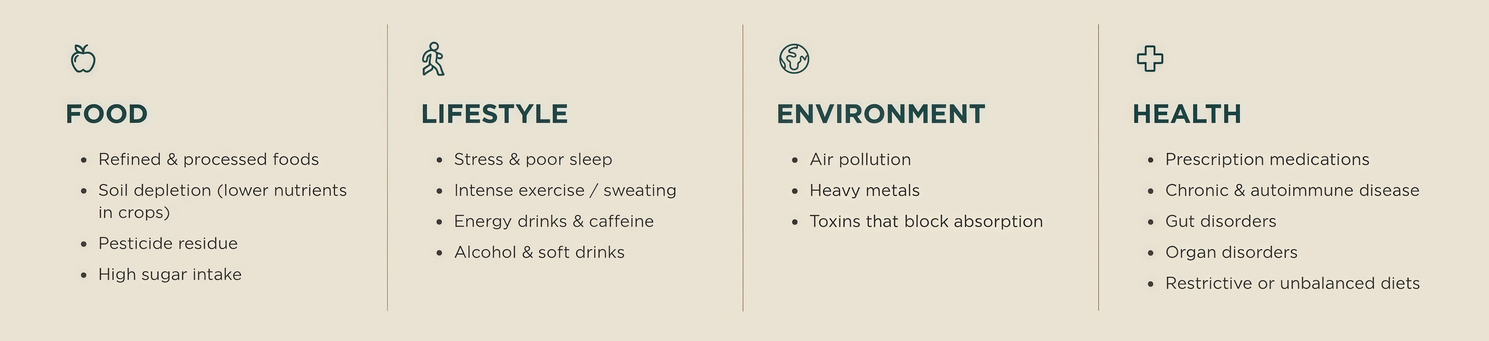 Mineral deficiencies aren’t random — they’re built into the way we live today. From depleted soil to daily stress, our bodies are constantly losing the nutrients they need. These are the four biggest drivers: